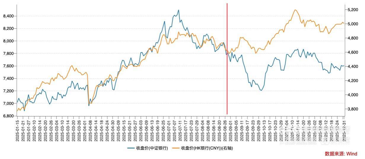 股价走势显示,中证银行指数与香港银行指数在去年上半年表现较好,年中因板块轮动出现回调,资金转向科技、成长等板块。同时,可以看出,2025年前8个月,两只指数走势高度一致,但从8月末开始,两者出现分化,且差距持续扩大直至年底。